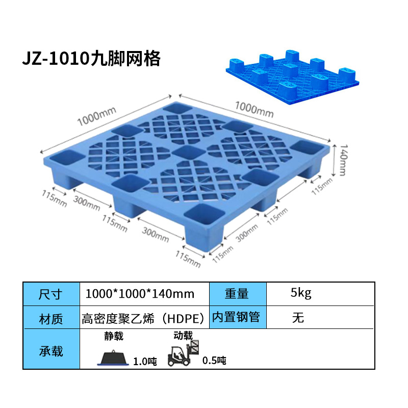 九腳網(wǎng)格塑料托盤的九腳網(wǎng)格托盤其底部是有‘九個腿’組成的,表面為‘網(wǎng)格’狀,行業(yè)為方便稱其為九腳網(wǎng)格托盤,九腳網(wǎng)格托盤大多型號的都為輕型的塑料托盤,不易用于上貨架或者較重貨物的周轉(zhuǎn)使用,大多情況下九腳網(wǎng)格塑料托盤都是用來倉庫貨物墊倉板防潮使用,對于輕型貨物的周轉(zhuǎn)也可