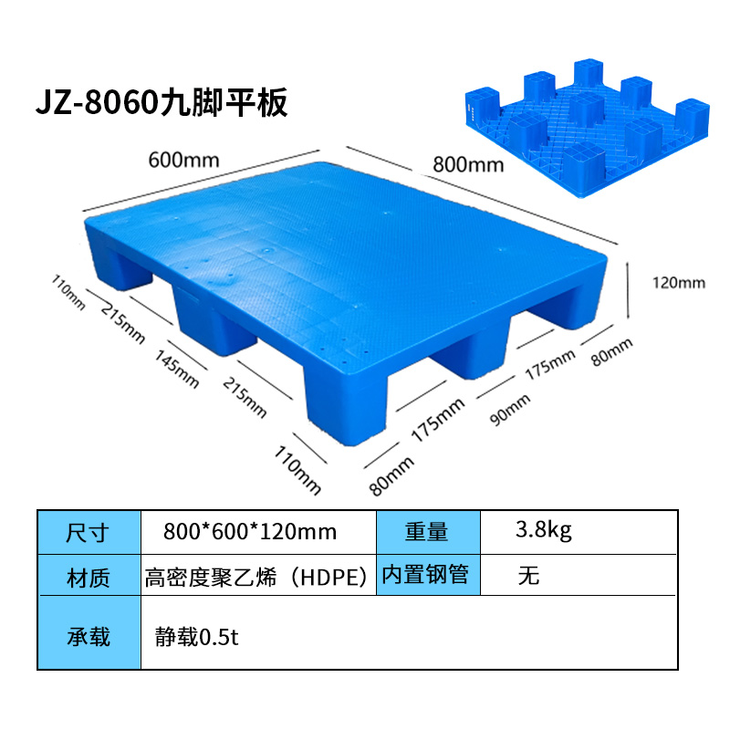 九腳平板塑料托盤(pán)底部為“九腳形”設(shè)計(jì)的塑料搬運(yùn)制品,其表面為平面,廣泛應(yīng)用于紡織廠、食品廠、醫(yī)藥廠等企業(yè)。這種托盤(pán)的設(shè)計(jì)特點(diǎn)包括輕質(zhì)、平穩(wěn)、美觀,無(wú)釘無(wú)刺,無(wú)毒無(wú)味,耐酸堿,不腐爛,不易被細(xì)菌繁殖,易清洗消毒,不助燃,無(wú)靜電,無(wú)火花,防暴,防滑溜,回收價(jià)值高。與鋼托盤(pán)、木托盤(pán)相比,九腳平板塑料托盤(pán)具有更好的環(huán)保性和安全性,能夠提升企業(yè)形象,提高物流效率。此外,九腳平板塑料托盤(pán)因其表面為平板狀,不易積累灰塵,方便清洗;受力均勻,對(duì)貨物有很好的保護(hù)作用;平面上均留有排氣小孔,具有良好的透氣性和防潮效果。這種托盤(pán)主要應(yīng)用于倉(cāng)庫(kù)輕型貨物墊倉(cāng)板、叉車(chē)周轉(zhuǎn)較輕貨物使用,不適合于上貨架或者轉(zhuǎn)載大重量的貨物?